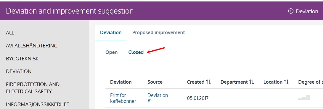 The business can choose to give employees access to view closed deviations in the deviation system. This makes it possible to learn from past events and support continuous improvement.