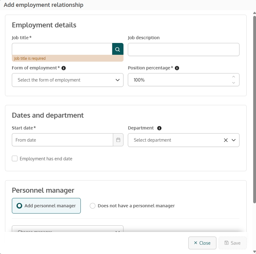 In an already created employment relationship, you can only change the choice of personnel manager, department affiliation and end date.